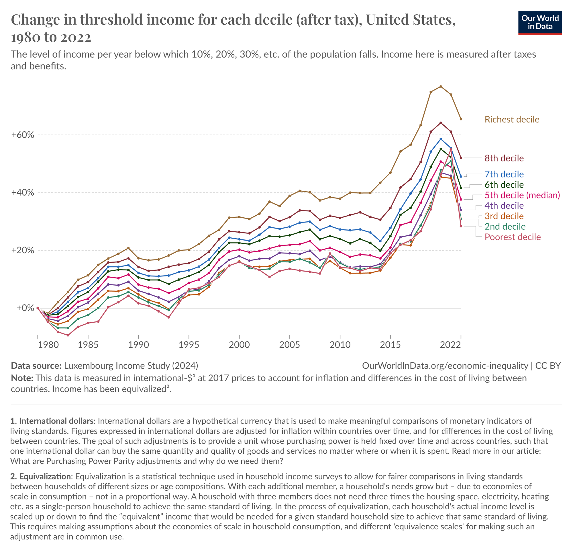 Since 1980 every decile of the American worker by income is better off - but the upper deciles are more better off. This makes sense when you think about the compounding effects of leverage - and I think it will likely continue to happen.
