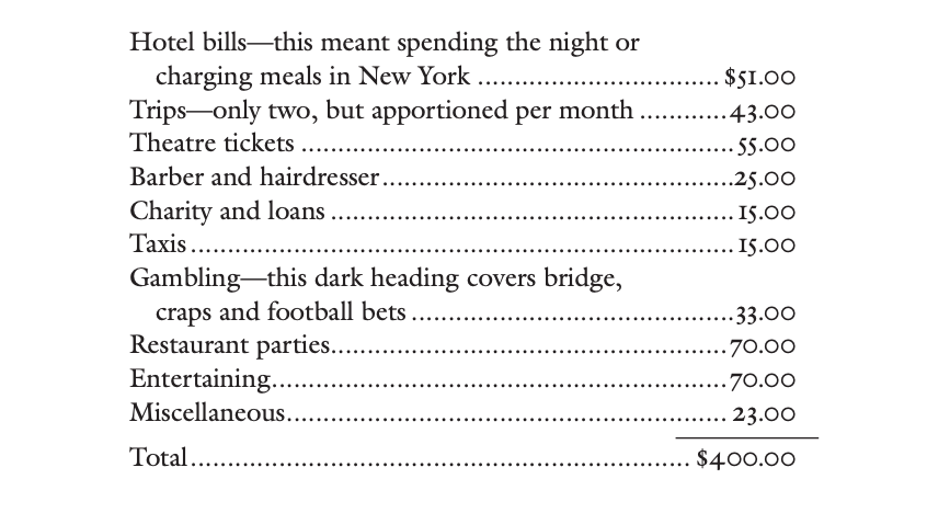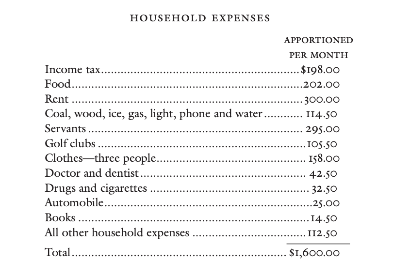 F Scott Fitzgerald wrote “How to live on $36,000 a year” in April 5, 1924 as a bit of a self critical joke - at the time it was a vast sum to spend. In the essay [0] he and his wife tally their expenses finding they spend about $24,000 a year on household and pleasure expenses - and yet are somehow missing another $12,000 per year they can not account for.