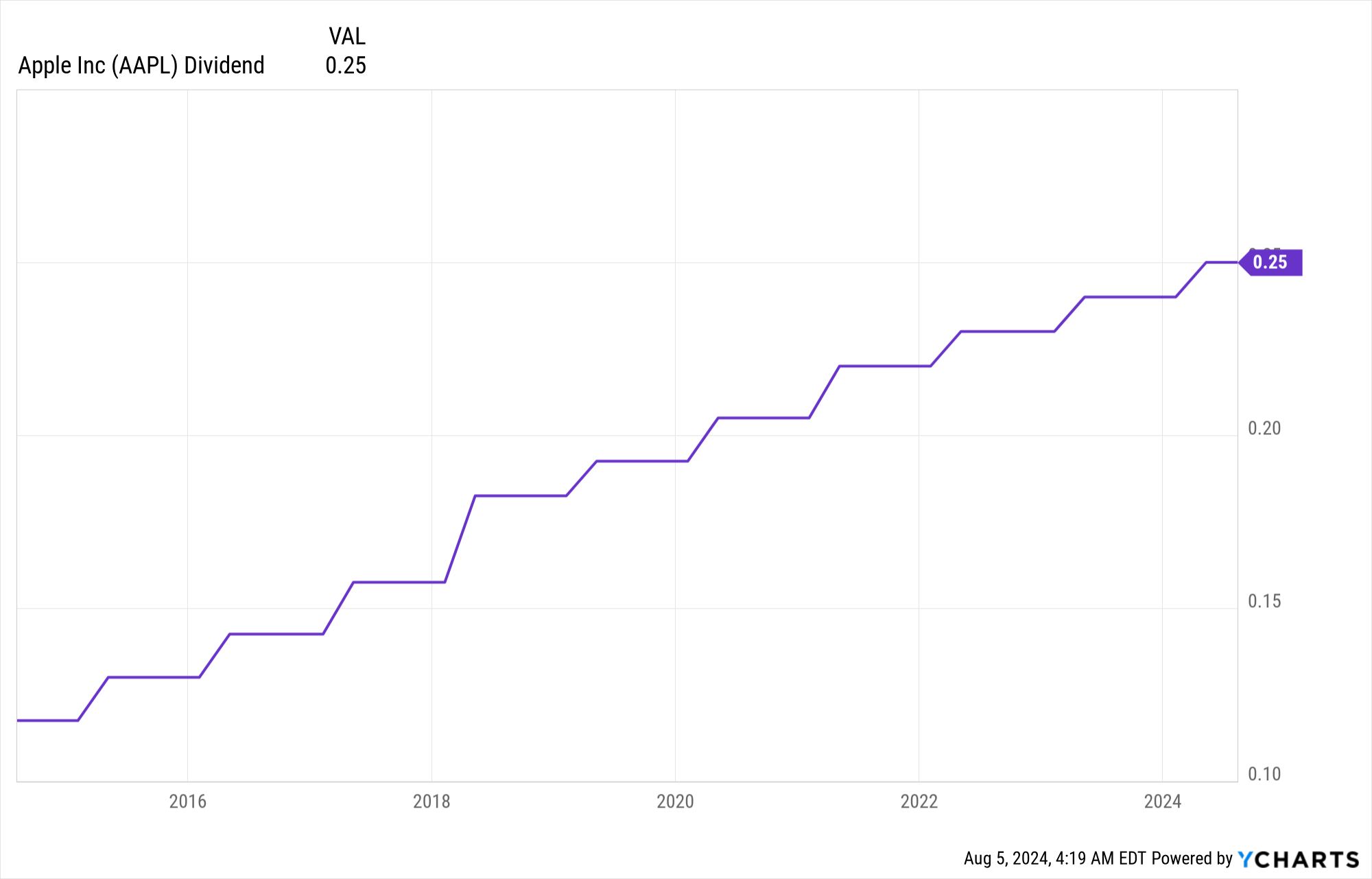 We can look at a chart of the trailing twelve months (TTM) dividends - this is the amount of income an investor would have owned for each share by holding for a year.