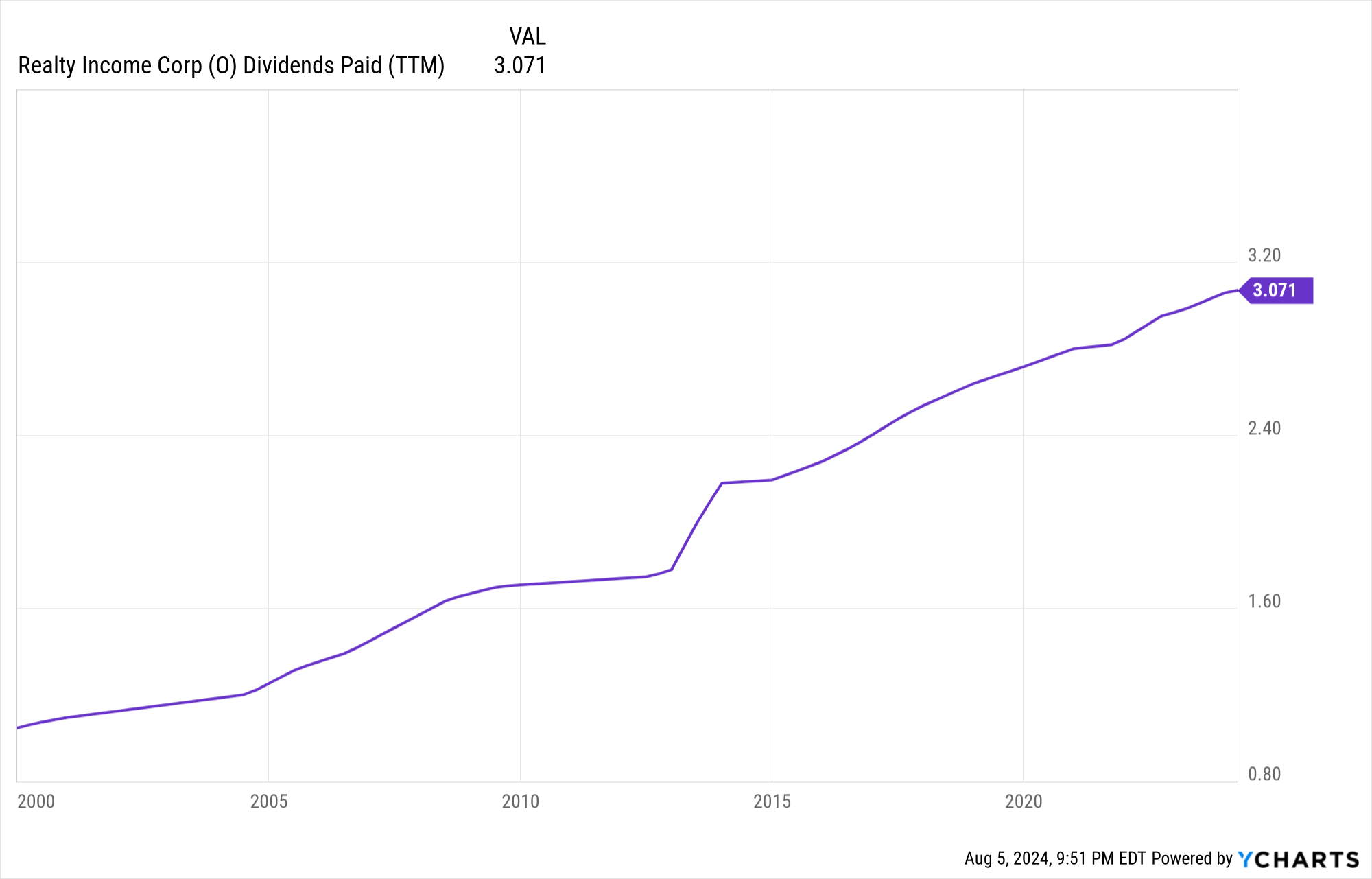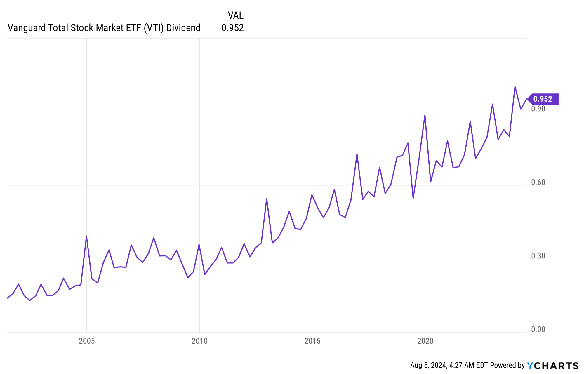 You can see here that over the last 20 years, similar to Reality Income, the VTI dividends has climbed pretty reliably (most of the choppiness is due to seasonality).