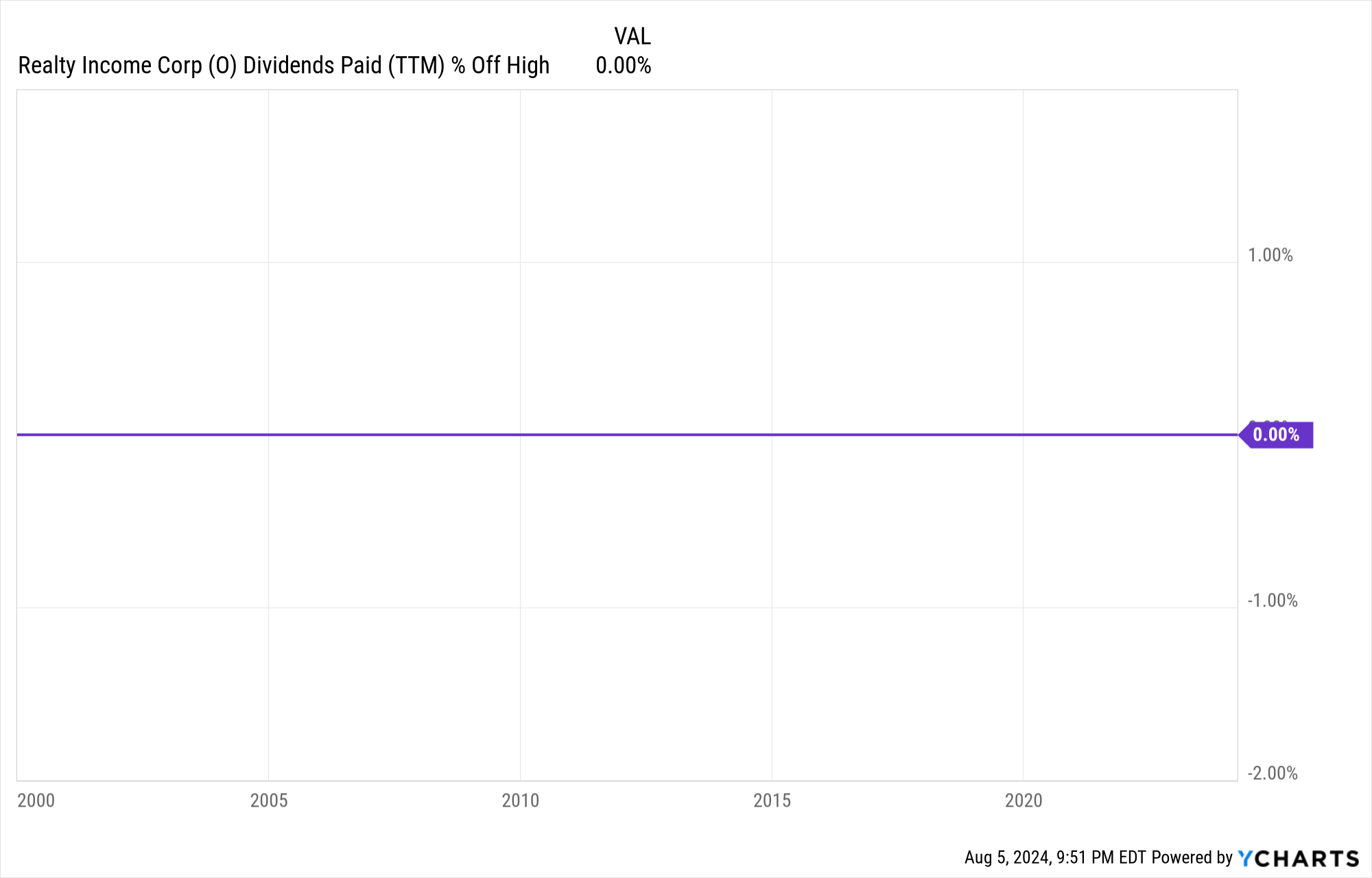In fact if you try to chart a "% off the high" view for the TTM dividends you'll see that they've never decreased the payment over the last 24 years: