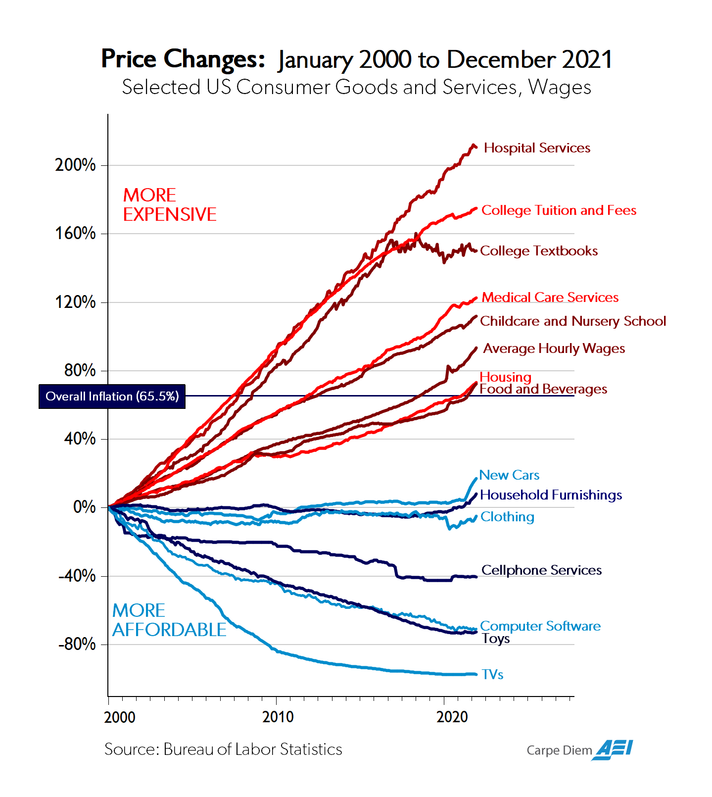 While overall price levels rose 65% between 2000 and 2021 the change was not uniform. Some things declined in value (in some cases massively) while others increased (in some cases massively).
