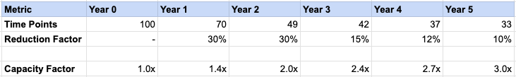 If today a worker spends 100 "time points" - just a way to simplify talking about hours to complete their workload – to complete their job and you can reduce it by 30% in year 1, 30% again in year two, etc. Even if you assume a large drop off in efficiency gains in the following years 2-3x improvement seems within reach: